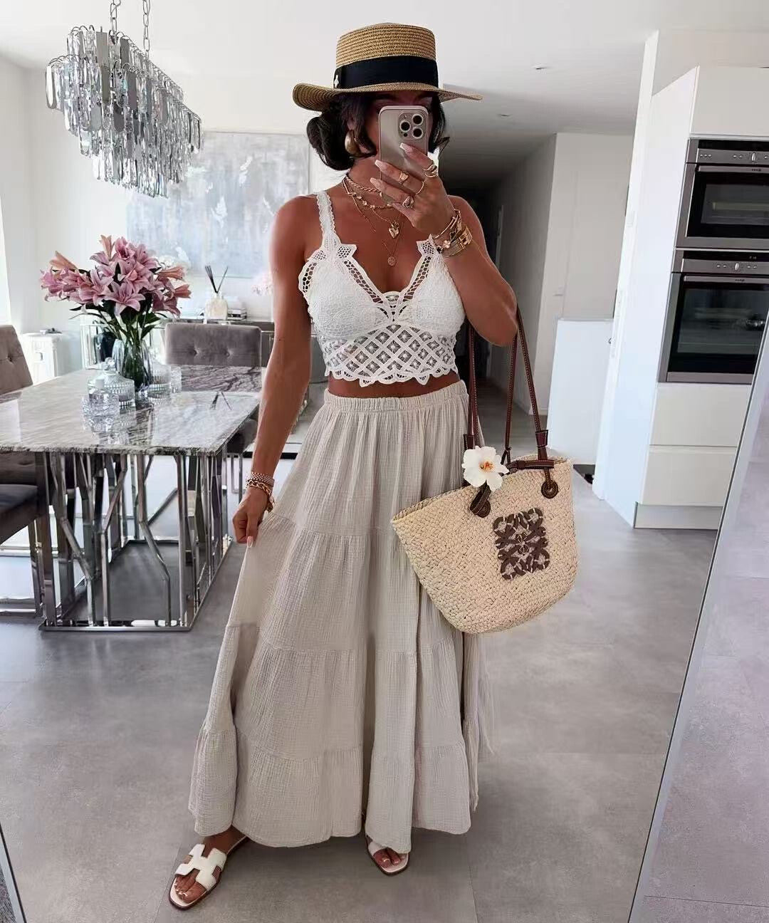 Confectionnée en gaze de coton ultra douce, cette jupe longue couleur beige offre un tombé aérien et féminin, avec sa taille élastique et ses larges volants.